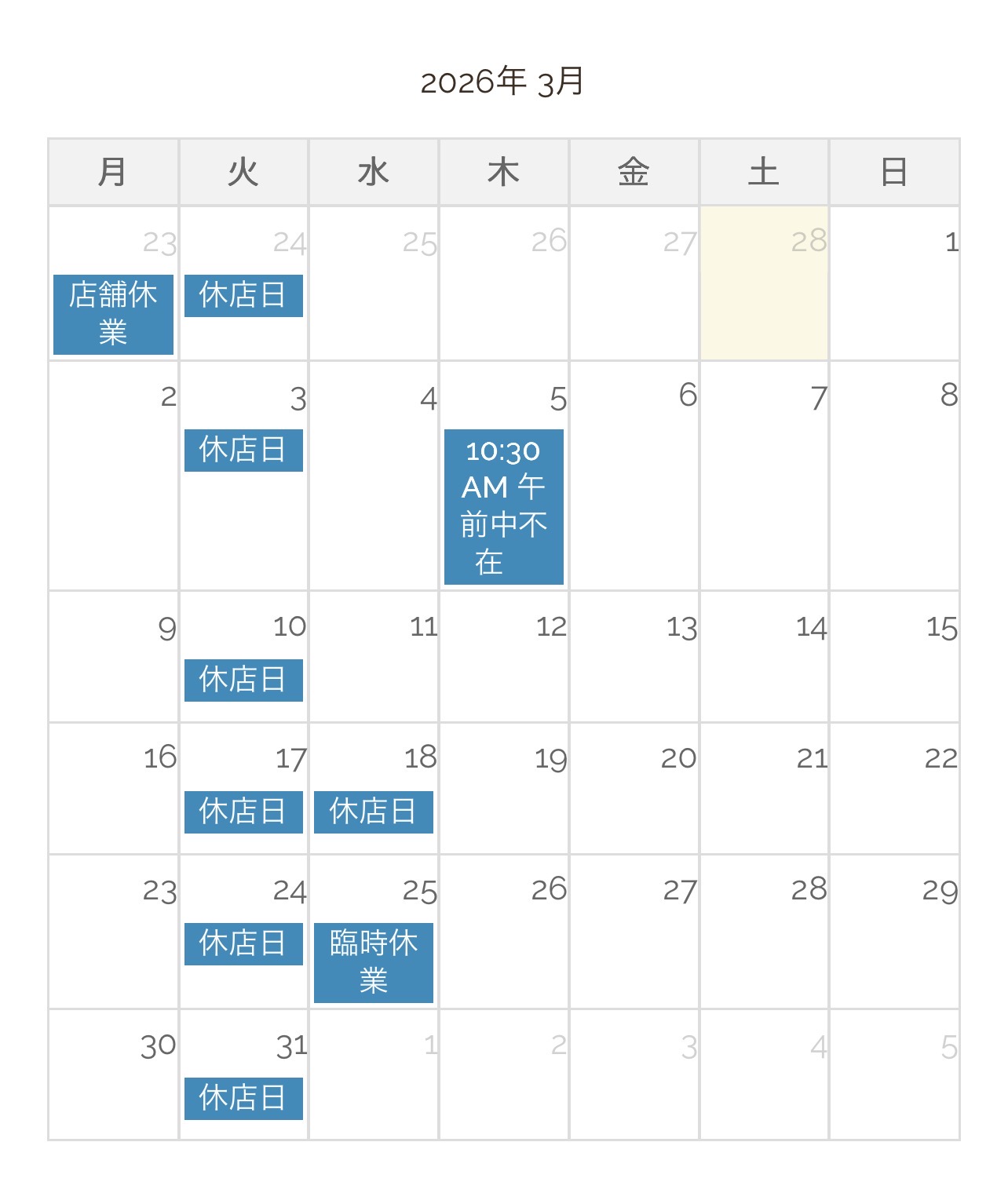 3月の営業日情報