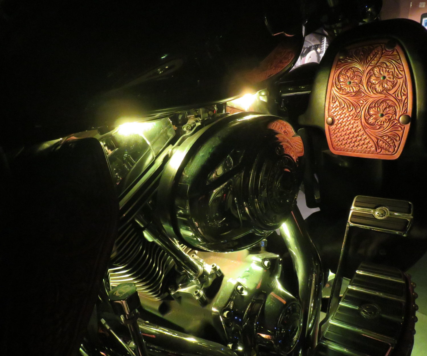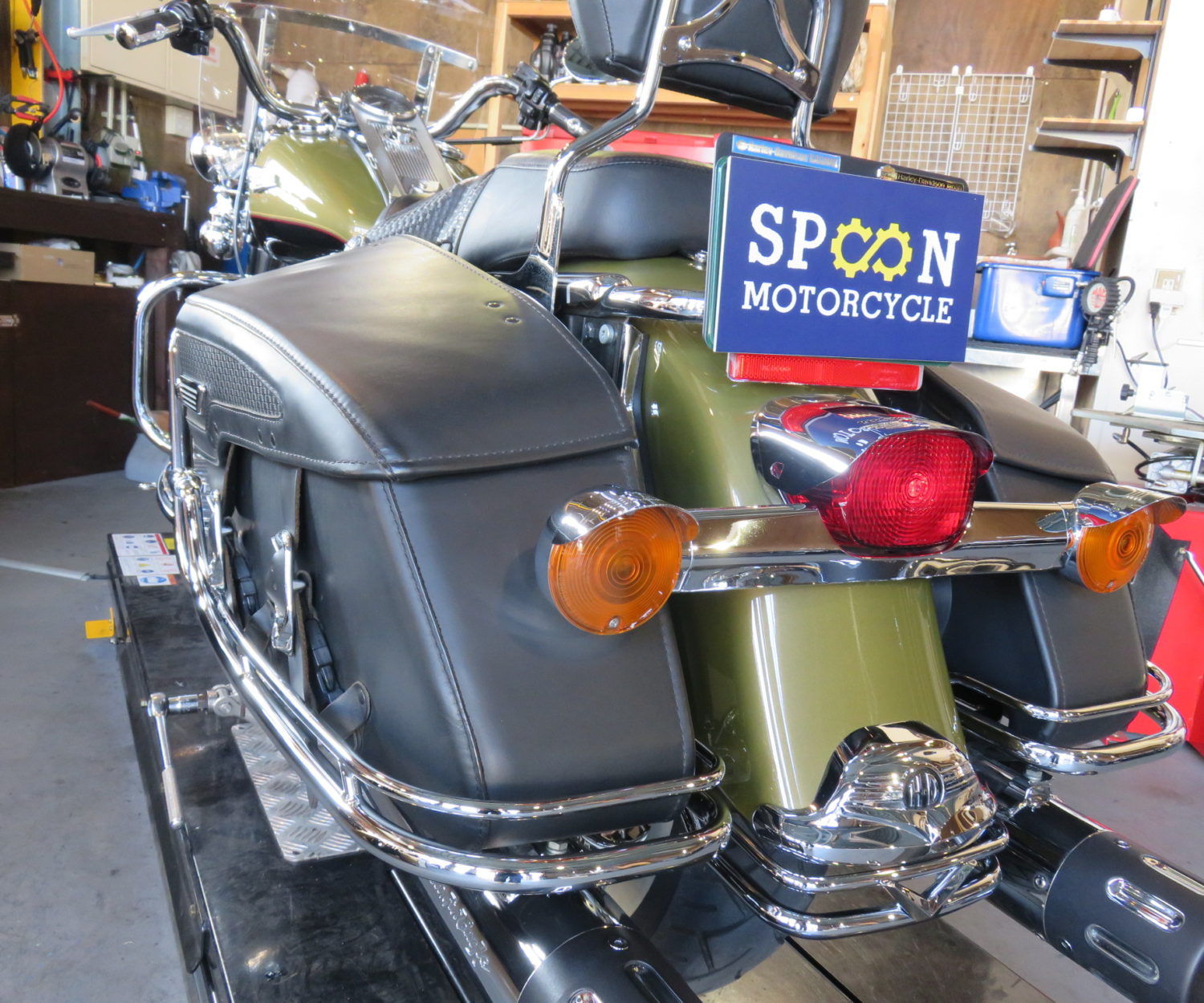 こんにちは(^^)/ 日に日に、寒暖差が激しくなり秋が深まっていますね☀ 今回は、LEDカラーライトのご紹介です。 FLHTCUに装着したのですが、写真では少しわかりにくいですね💦 レッド・ライム・アイスブルー・スカイブルー・ダークブルー・パープルなど色が変化します。 変化するパターンも何種類かあって、目立つこと間違いなしです✨ 反対側にもつけてます✨ 実車のほうが、もっともっといい雰囲気が出てますよ~(*'▽') レザーもパワーアップしてましたね。 本日お持ち帰りいただきましたので、夜に点けた感想お待ちしています♫ ありがとうございました❢