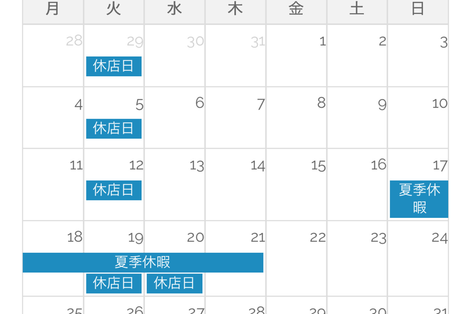 8/17(日)~8/21(木)までを定休日と合わせて夏季休暇とさせていただきます。